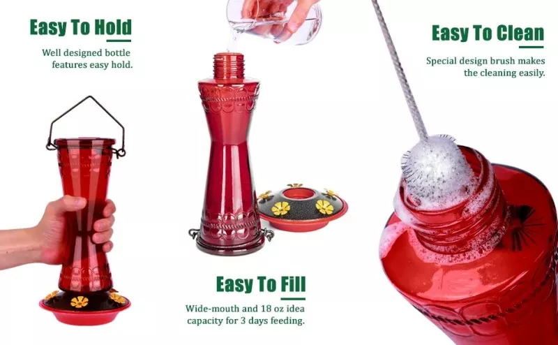 1.Elegant Glass Design: Our Hummingbird Feeder is a beautiful garden accessory that perfectly blends style and function. Its slim waist bottle shape design is both easy to hold and visually appealing, making it an ideal choice for ladies.